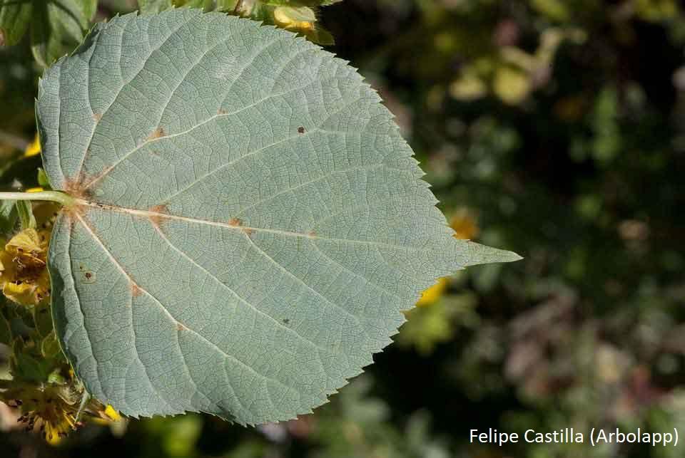 Su nombre latino alude a la forma de corazón que tienen sus hojas. Si las observas de cerca, y las miras por el envés, verás que tiene unos pelillos del color del hierro oxidado, visibles sobre todo entre las uniones de los nervios y que las diferencia de las hojas de la otra especie que habita en este parque, el tilo híbrido de Holanda.