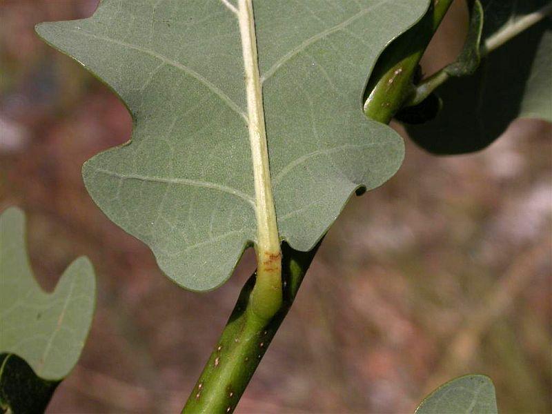 Aunque los robles es fácil que hibriden entre sí, las bellotas del roble del país penden de un largo rabillo o pedúnculo, de ahí su nombre común. La hoja con sus lóbulos redondeados, la diferenciarás fácilmente, crece casi pegada a la rama, con dos pequeñas orejuelas en su base.