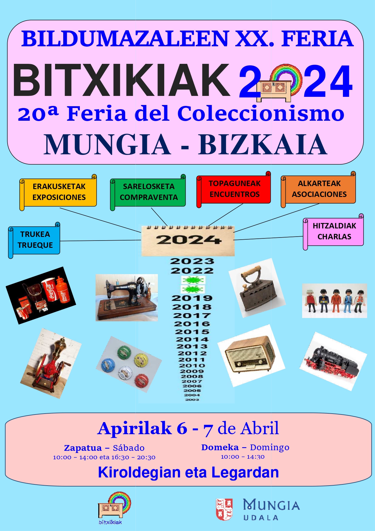La XX edición de la Feria del Coleccionismo de Bitxikiak vuelve a Mungia los días 6 y 7 de abril. Así, se podrá disfrutar de una de las citas más importantes dentro del mundo del coleccionismo tanto en el Polideportivo municipal como en la zona escolar de Legarda, el sábado 6 de 10.00 a 14.00 horas y de 16.30 a 20.30 horas, y el domingo 7, en horario de mañana, de 10.00 a 14.30 horas.