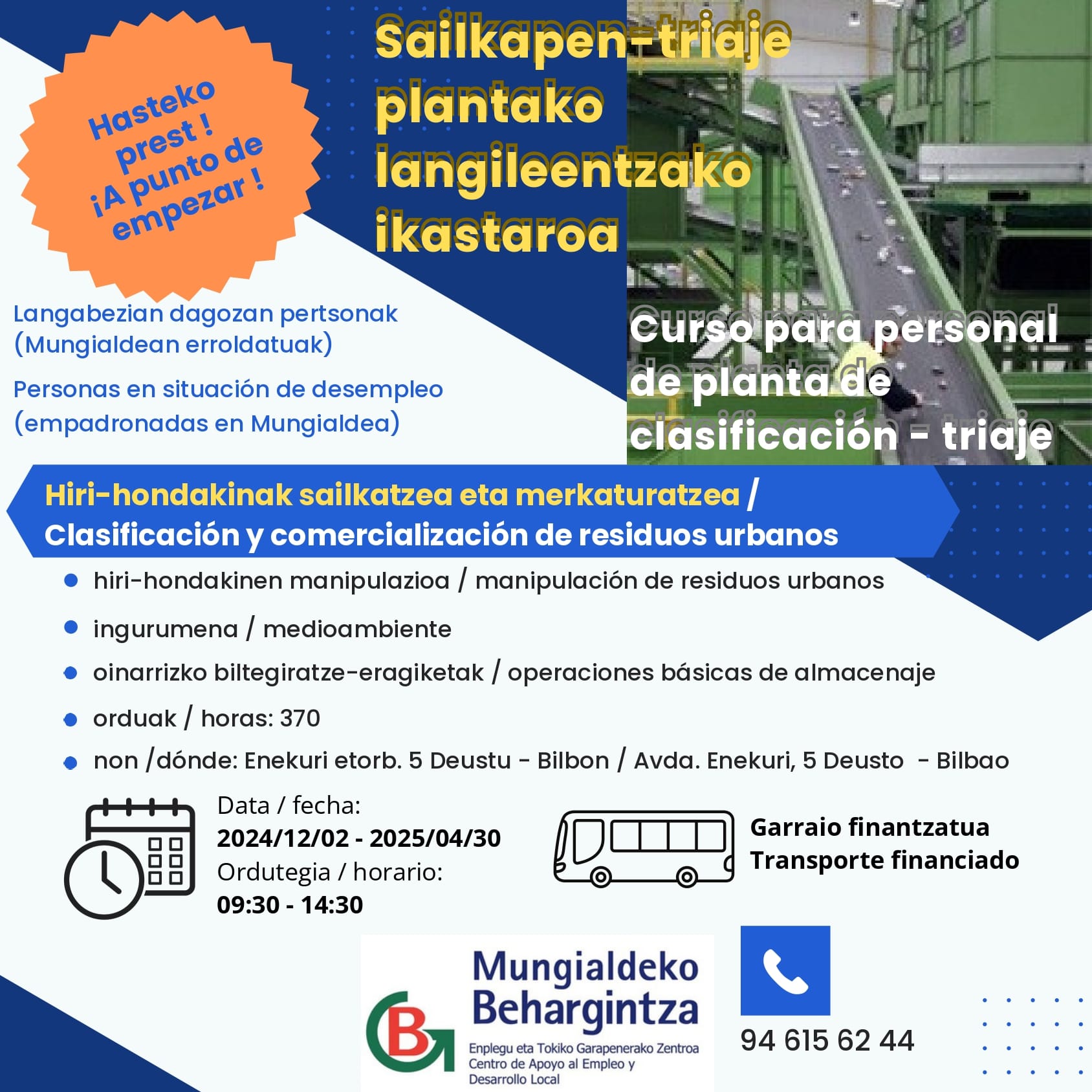 El Ayuntamiento de Mungia, a través del Departamento de Empleo y Promoción Económica, Mungialdeko Behargintza, pone en marcha una acción formativa novedosa orientada a personas desempleadas o que buscan mejorar su empleo en el municipio. Se trata de un curso que impartirá Koopera, empresa de inserción social ubicada en el barrio Zabalondo de Mungia, que no solo busca cualificar profesionalmente a las y los participantes, sino también ofrecerles una oportunidad laboral, ya sea en la misma o en otras empresas del sector. La iniciativa responde a las demandas del mercado laboral local, especialmente en el ámbito del reciclaje y la sostenibilidad.