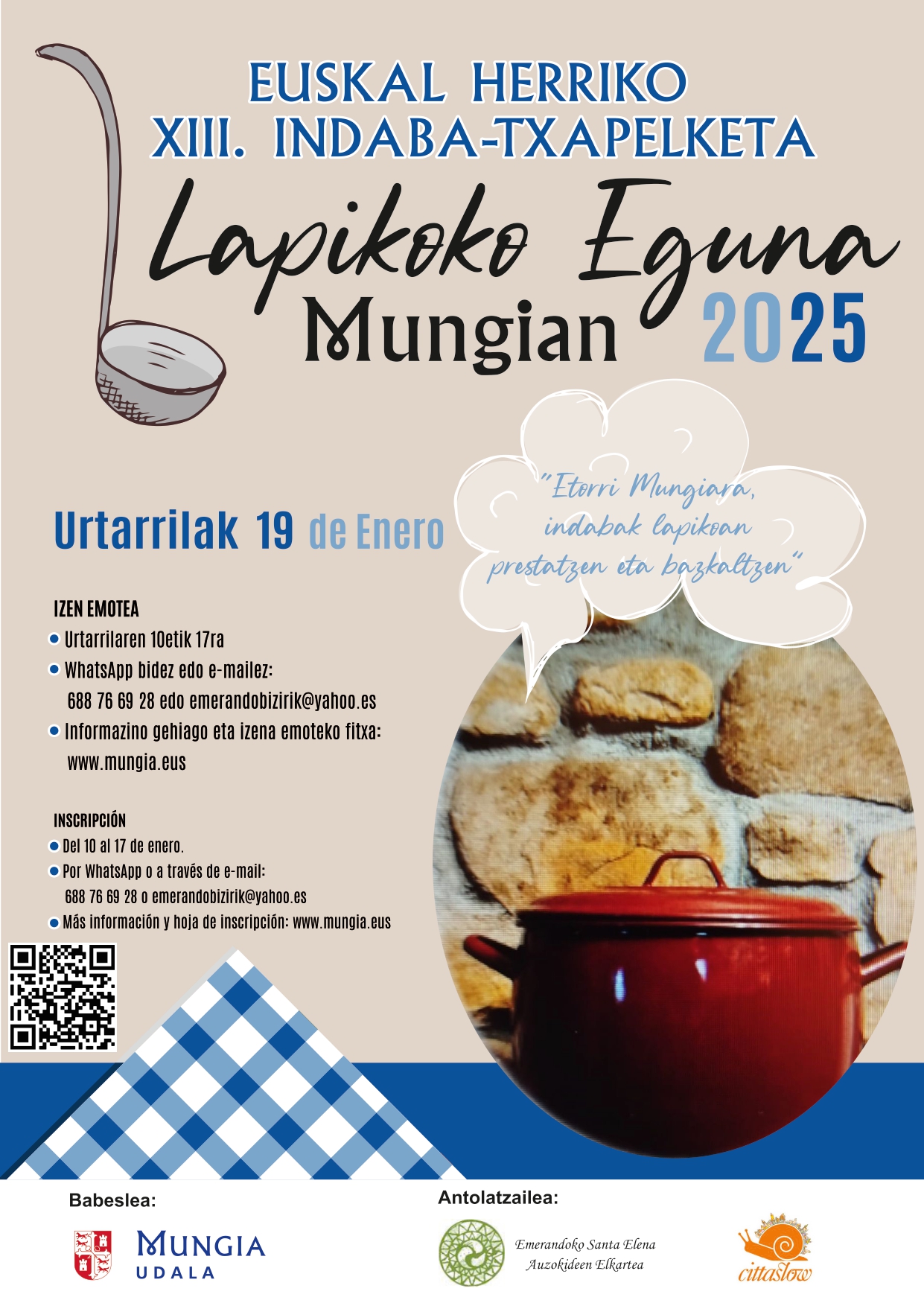 El día después de San Antontxu, 19 de enero, se celebrará el Lapikoko Eguna, con la XIII edición del concurso de Alubias de Euskadi, organizado por Emerando Santa Elena Auzokideen Elkartea en colaboración con el Ayuntamiento de Mungia. Este se llevará a cabo en Matxin Plaza y en Foruen Plaza. Respecto a las normas del concurso, cabe destacar que los y las participantes, además de no poder usar pucheras y ollas rápidas, solo podrán utilizar los siguientes ingredientes: alubia roja, (tipo tolosana, negra o pinta) patatas, verduras, incluido el pimiento choricero, tocino, costilla, chorizo y morcilla. Las valoraciones y el reparto de premios tendrán lugar a las 15:00 horas. Hoja de inscripción y bases en los documentos abajo adjuntos.