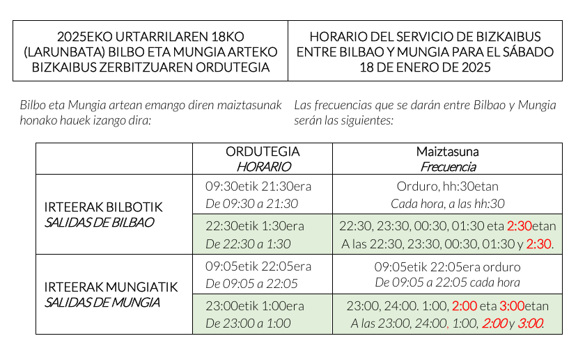 Horario del servicio de Bizkaibus entre Bilbao y Mungia:
