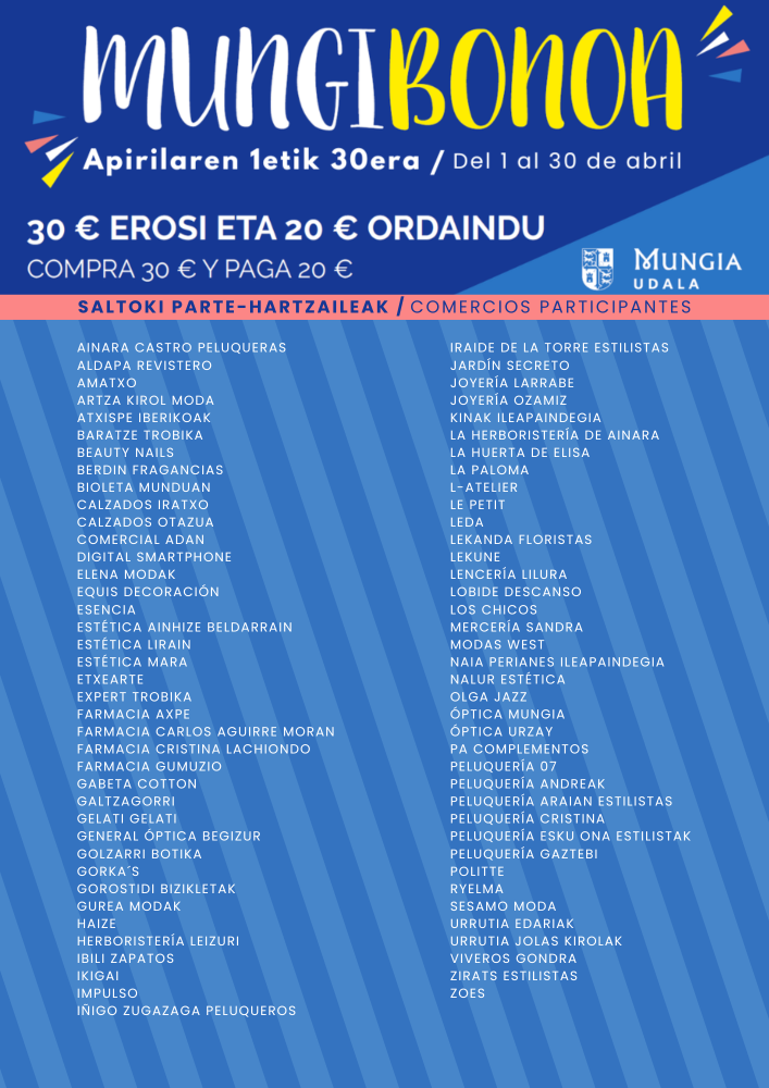 El Ayuntamiento de Mungia vuelve a poner en marcha a partir del 1 de abril una nueva edición de la campaña Mungibonoa, enmarcada dentro del programa ‘Mungia Indartzen’. El objetivo de esta iniciativa es dinamizar la actividad comercial del municipio, así como incentivar la compra en los establecimientos de la localidad, y cuenta con la colaboración con la Asociación de Comerciantes y Hosteleros de Mungia.