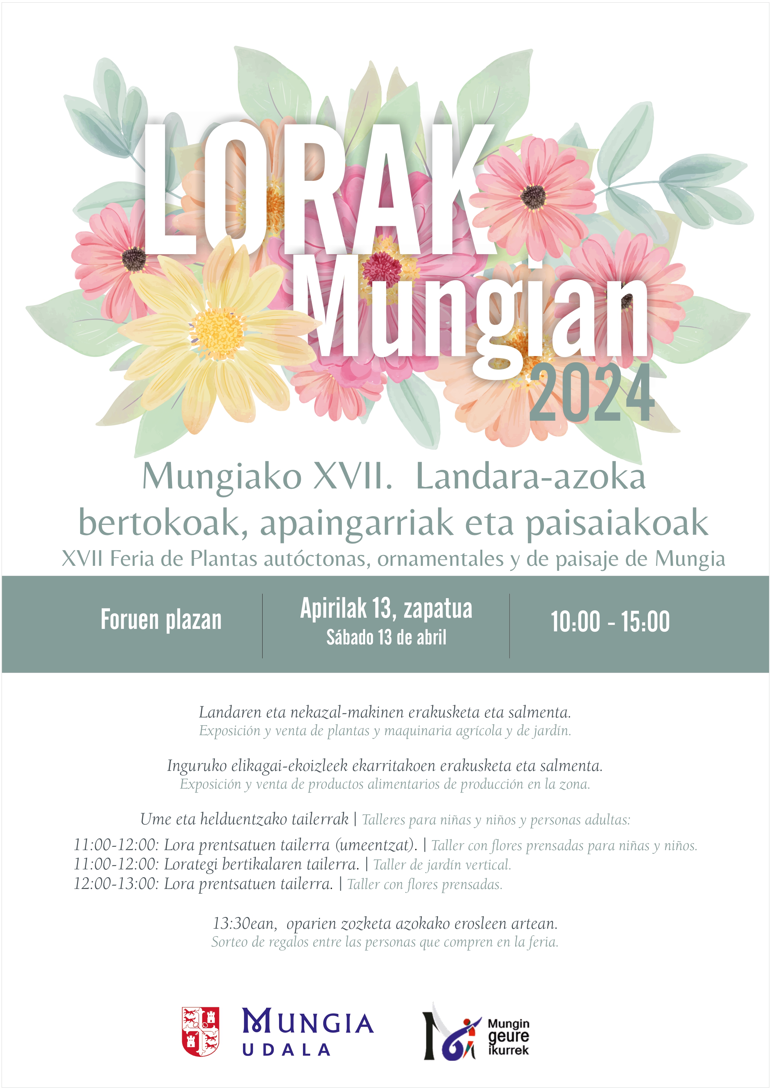 Mungia acogerá la Feria de plantas autóctonas, ornamentales y de paisaje el próximo sábado 13 de abril en la Plaza de los Fueros, Plaza Euskal Pizkundea, Plaza Matxin y en caso de lluvia, en la zona de Andra Mari. Se trata de una feria que acerca los productos de temporada y plantas autóctonas, ornamentales y paisajísticas a la localidad.