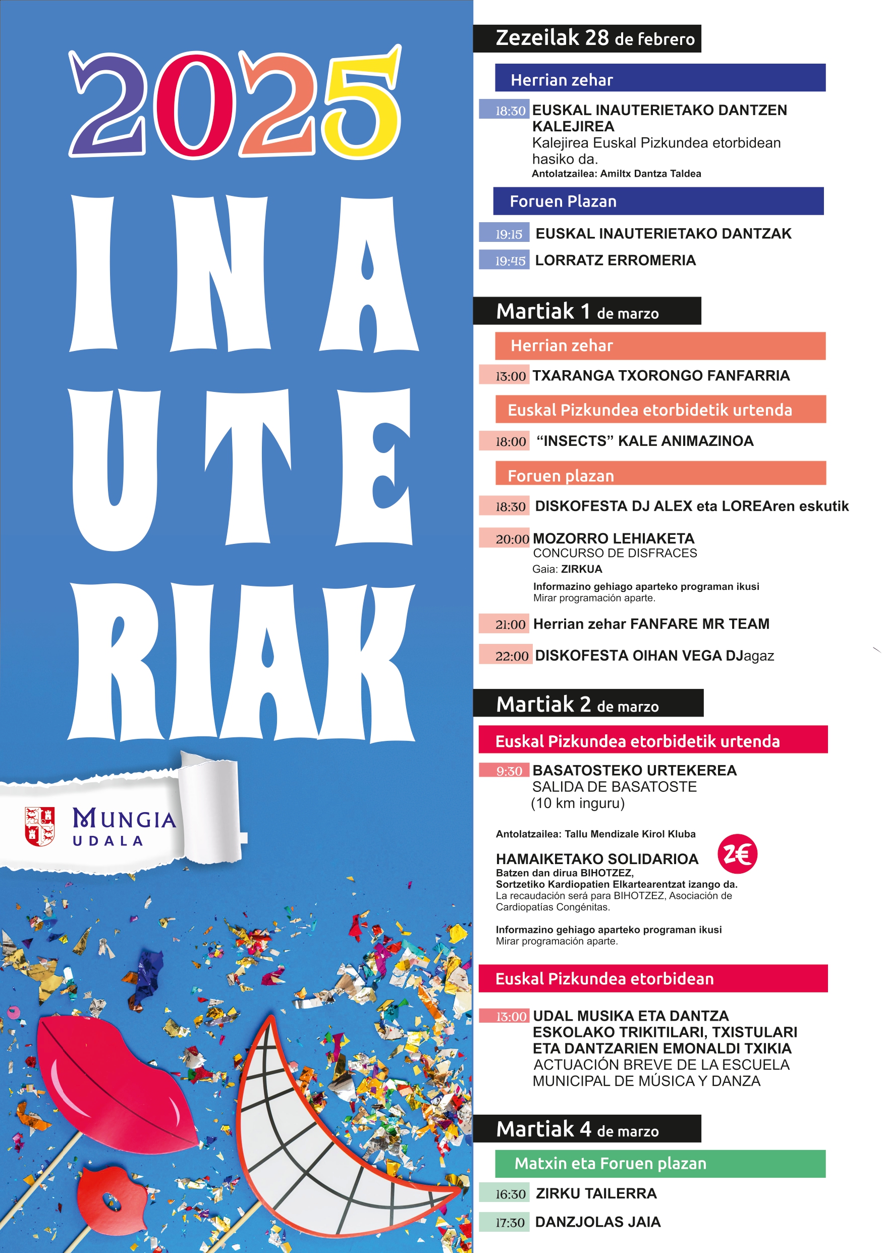 Así, la programación de este año recoge actividades de lo más variadas y participativas. El programa festivo arrancará el viernes 28 de febrero por la tarde, a las 18:30 horas, con “Euskal Inauterietako Dantzen Kalejira”, organizada por Amilotx Dantza Taldea, y que partirá de Euskal Pizkunde Etorbidea. Una vez finalizado el pasacalles, ofrecerán el espectáculo “Euskal Inauterietako Dantzak” sobre las 19:15 horas en la Foruen plaza. Posteriormente y en el mismo lugar, será el turno de la Romería Lorratz.