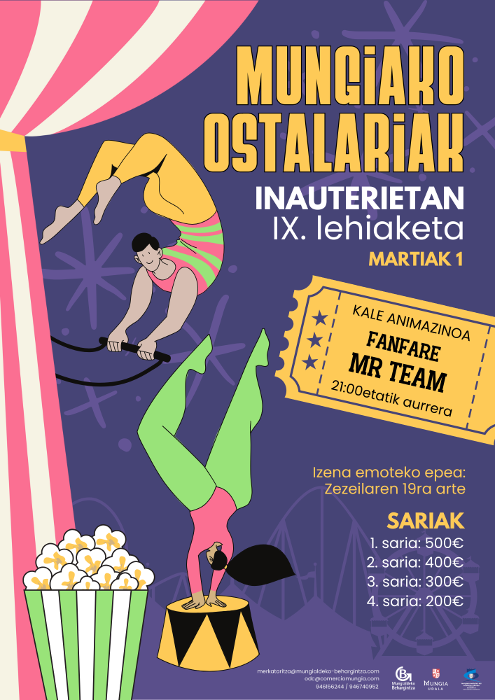 El sábado 1 de marzo se llevarán a cabo los habituales concursos de disfraces, para la ciudadanía en general y la IX edición de “Ostalariak Inauterietan”. El primero de ellos, comenzará a las 20:00 horas en Foruen plaza, con “el circo” como protagonista.  Se repartirán numerosos premios recibiendo la persona o grupo ganador un bono de 250 euros para gastar en los establecimientos del pueblo, y el segundo y tercero de 200 y 150 euros, respectivamente. Además, sacarse una foto en el photocall podrá tener premio de hasta 100 euros para gastar en los comercios de la localidad. Las inscripciones para participar en este concurso están abiertas hasta el 28 de febrero en Gaztegunea.