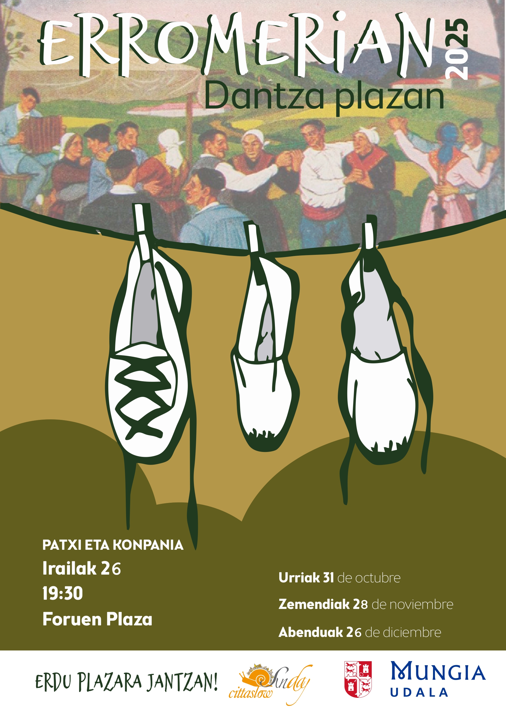 Mungia continúa promoviendo la cultura vasca. Tras el éxito de las pasadas ediciones, un año más, con la llegada de septiembre Foruen plaza recupera “Erromerian”, una actividad que busca recuperar la plaza como lugar popular de la danza tradicional, al mismo tiempo que se le brinda un importante espacio dentro de la programación cultural a algo tan arraigado en la localidad mungiarra como son las Euskal Dantzak. Como viene siendo habitual se celebrará en Foruen enparantza los últimos viernes de cada mes, y en caso de lluvia se trasladará a Andra Mari.
