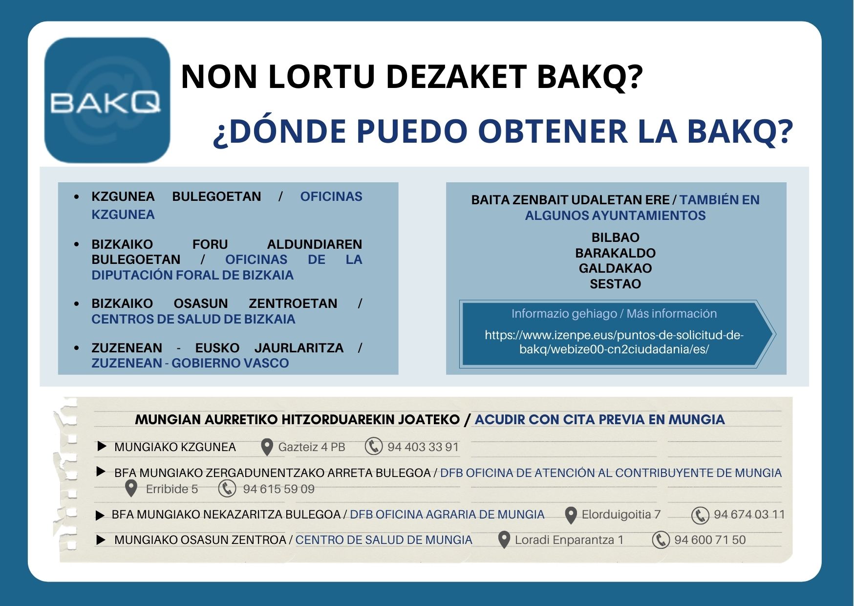Puntos donde puedes tramitar la BakQ en Mungia.