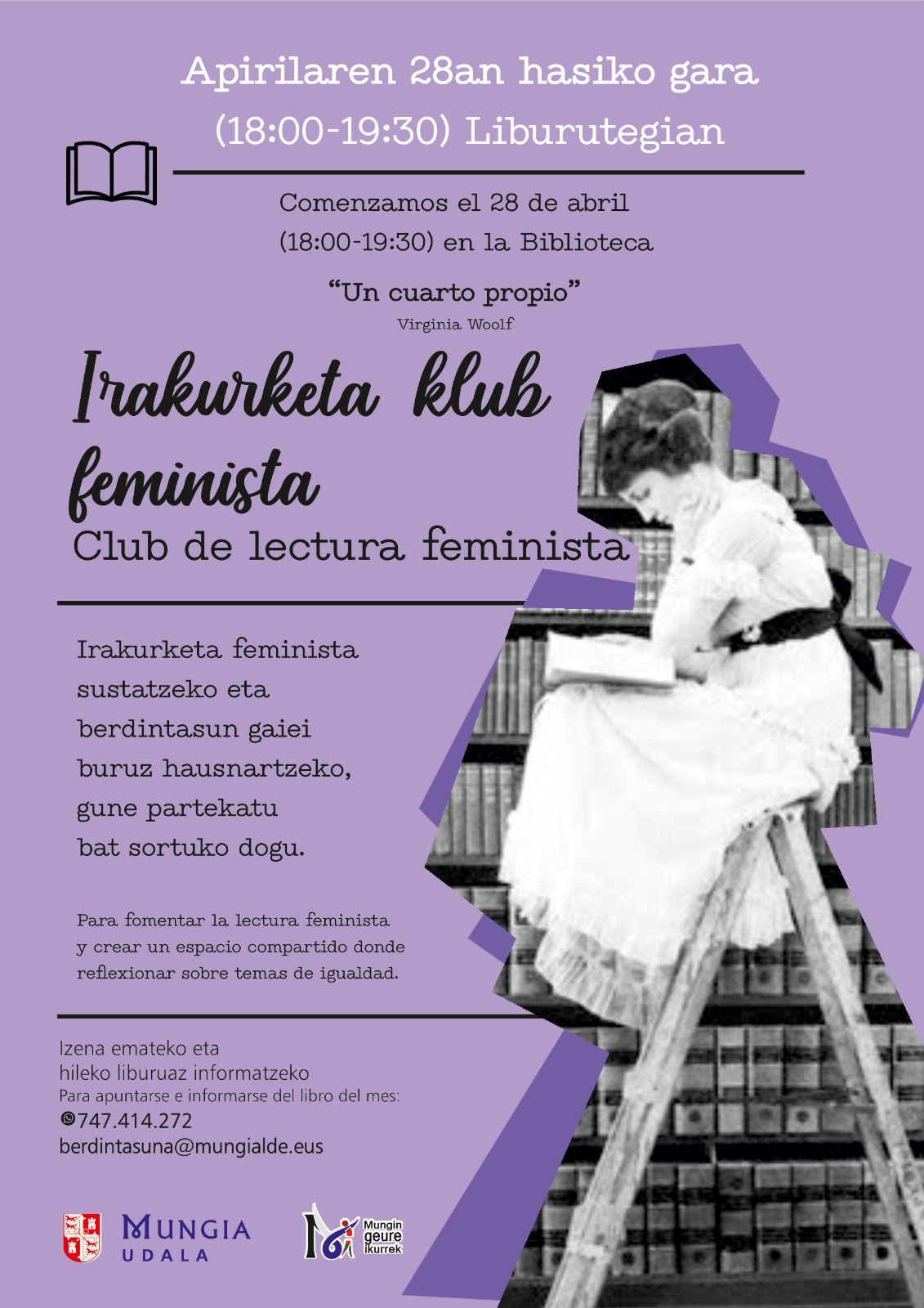 Izena emateko eta hileroko liburuari buruzko informazioa lortzeko, interesdunek 747 414 272 telefonora deitu dezakete edo berdintasuna@mungialde.eus helbide elektronikora idatzi.