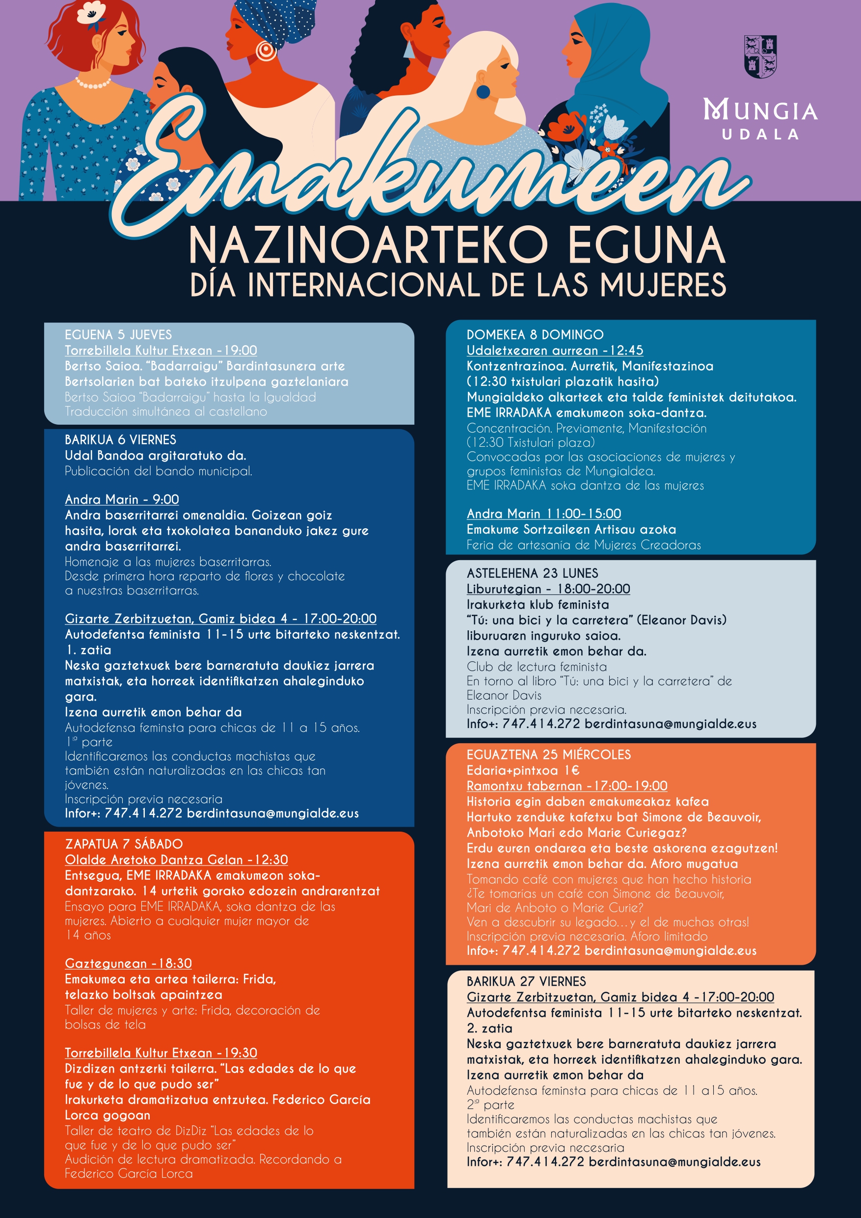 Martxoaren 8an, igandea, programazioaren ekitaldi nagusia izango da. 12:30ean manifestazioa abiatuko da Txistulari plazatik, Mungialdeko emakume elkarteek eta talde feministek deituta. 12:45ean elkarretaratzea egingo da udaletxearen aurrean, eta, horrez gain, emakumeen soka-dantza egingo da.