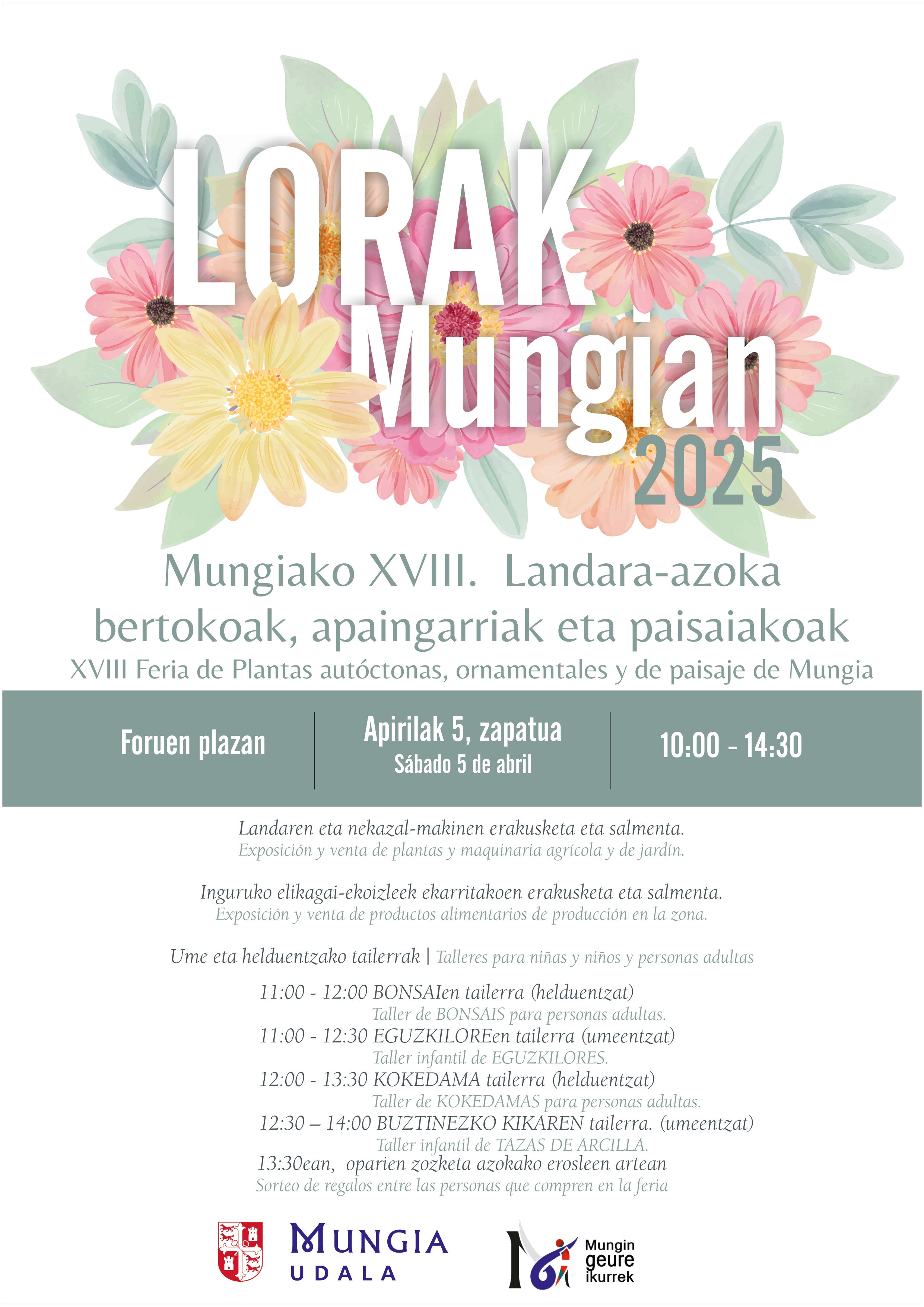Beste urte batez, Mungian landare autoktono, apaingarri eta paisaieko XVIII. azoka egingo da apirilaren 5ean, larunbata, Foruen plazan, 10:00etatik 14:30era. Bertako landareak, landare apaingarriak eta paisaia-landareak herrira hurbiltzen dituen azoka da.