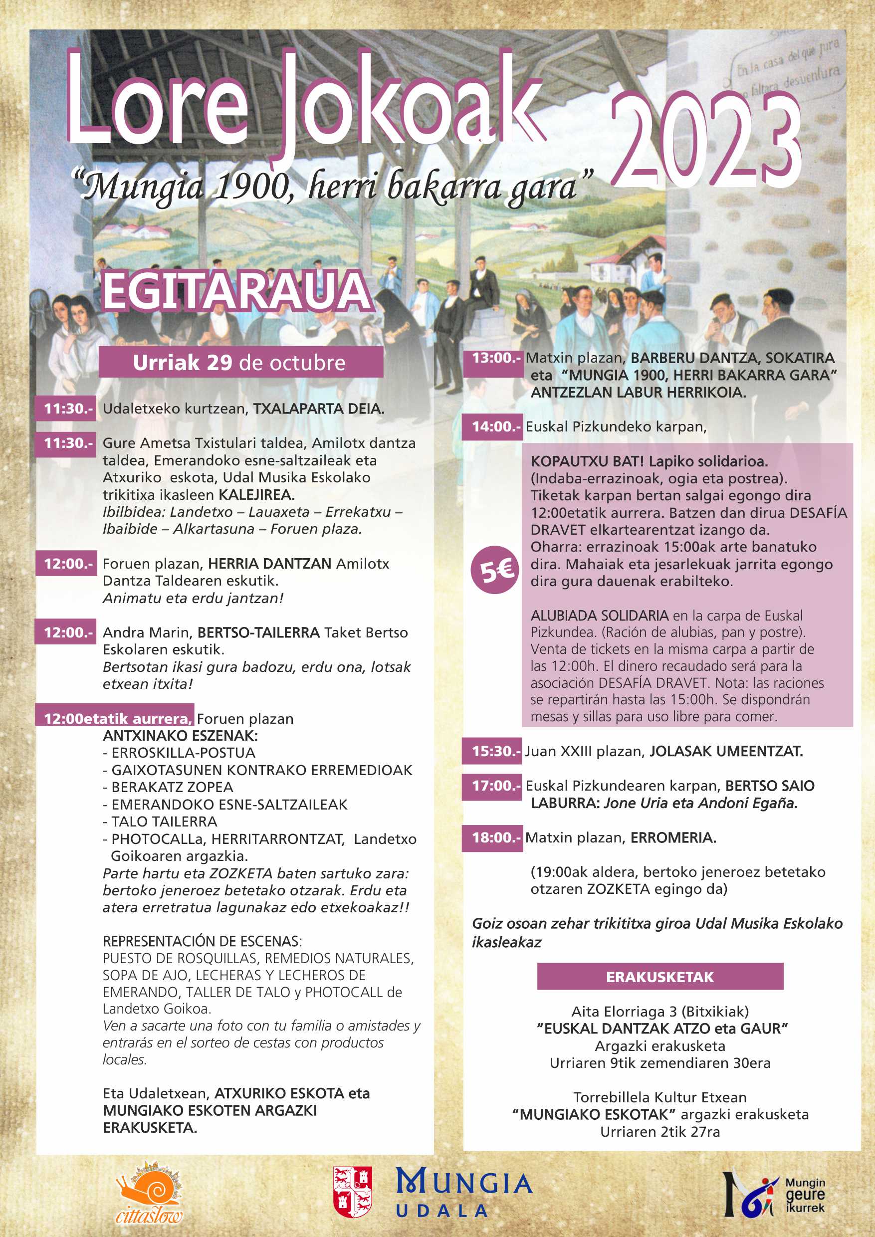 Lore Jokoak jaialdiaren hamazazpigarren edizio hau Mungiako bizitza sozialaren eta ohituren isla izango da, musikaz, euskal dantzaz, bertsolariz, antzerki herrikoiz eta gastronomiaz beteriko programazioarekin, besteak beste. Eguna 11:30etan hasiko da, txalapartaren ohiko deiarekin, Udaletxearen bidegurutzetik, eta kalejirarekin, Landetxotik, Atxurizubi, Usandizaga, Lauaxeta, Errekatxu, Ibaibide eta Alkartasunetik pasatuz, Foruen plazara iritsi arte 12:00etan, Herria Dantzan ekimenari hasiera emateko. Bertan nahi duten pertsona guztiek dantza egin ahal izango dute. Ondoren, Foruen plazan, hainbat emanaldi tradizional egingo dira: erroskila postua, baratxuri zopa dastatzea, talo tailerra, esne-saltzaileen eszena, etxeko erremedioak eta Landetxo Goikoaren erreprodukzioa, udalerriko ondare ikono nabarmena eta identitarioa, hain zuzen.