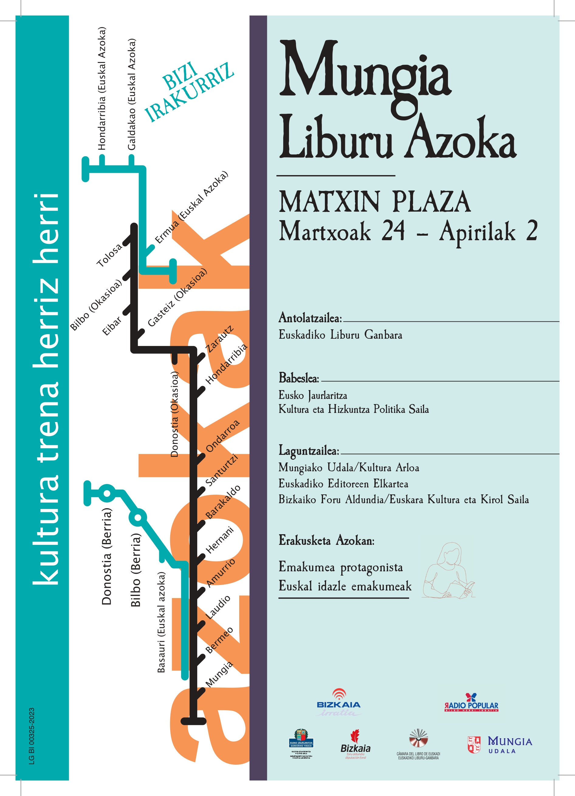 Mungian, 2023ko martiaren 22an. Beste urte batez, Euskadiko Liburu Ganberak Mungiako Udalagaz, Euskadiko Editoreen Elkarteagaz, Eusko Jaurlaritzagaz eta Bizkaiko Foru Aldundiko Euskera, Kultura eta Kirol Sailagaz lankidetzan antolatuta, Mungiak Euskal Liburu eta Disko Azoka hartuko dau Matxin plazan martiaren 24tik apirilaren 2ra. Hamalau erakusketari izango dira Euskadiko Liburu Azoka Ibiltarien lehen kanpaina osotuko dabenak, liburu-denda, argitaletxe, banatzaile eta erakundeen parte-hartzeagaz. Mungian hasiko dira Euskal Autonomia Erkidegoan zehar egingo diran hamalau liburu azokak. Ordutegia 11:00etatik 14:00etara eta 17:00etatik 20:30era izango da.