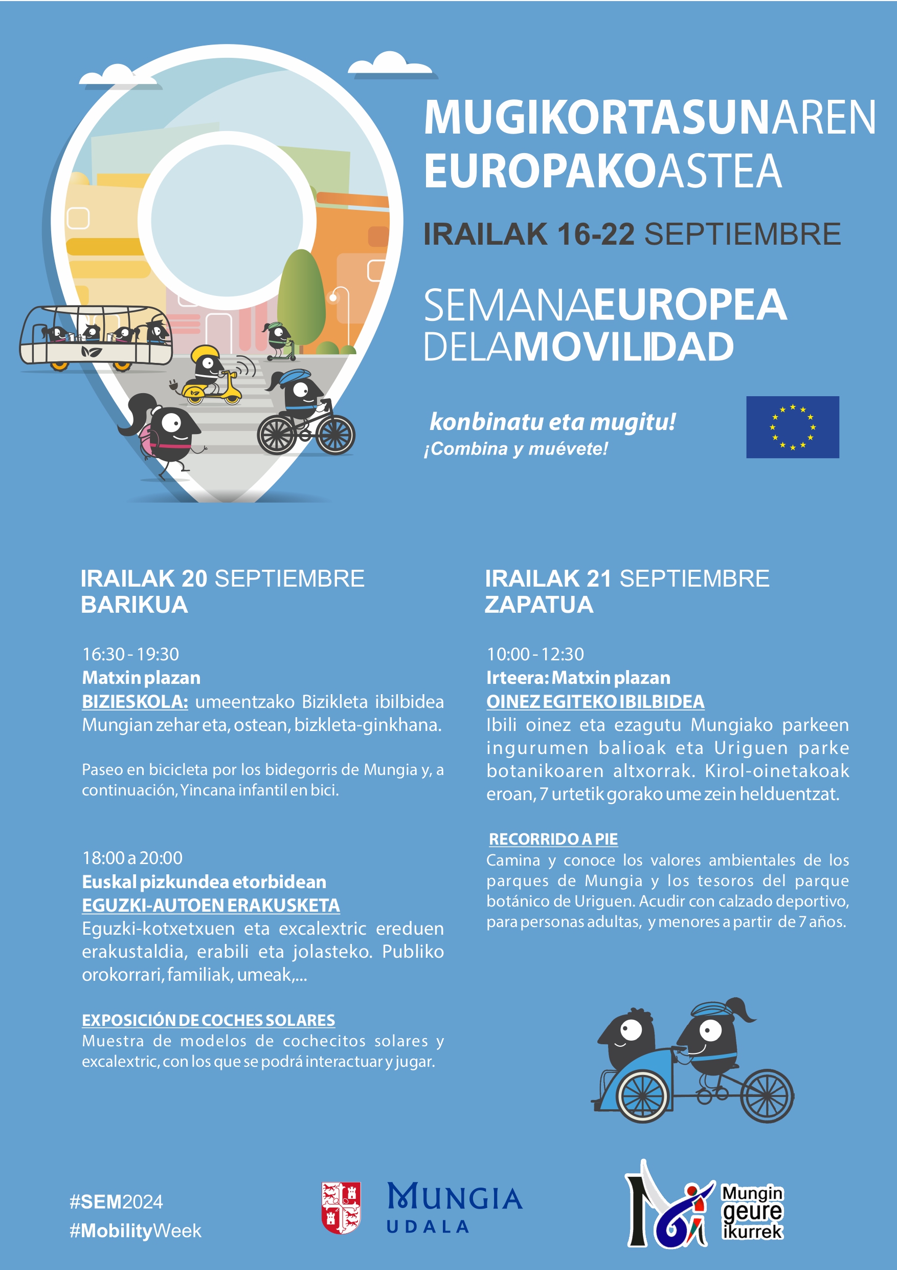 Mungiako Udalak bat egin du aurten ere Mugikortasunaren Europako Astearekin, eta 2030 Agendaren barruan hainbat jarduera antolatu ditu irailaren 19tik 22ra, mugikortasun iraunkorra sustatzeko eta herritarrak emisio kutsatzaileak murriztearen garrantziaz kontzientziatzeko. Aurten, garraiobide desberdinen konbinazioa sustatzen duen Europako kanpainaren lelopean, egoera bakoitzean garraiobide egokiena erabiltzeko aukerari buruz hausnartzera gonbidatzen da, berotegi-efektuko gasen murrizketa eta hiriko airearen kalitatearen hobekuntza sustatuz.