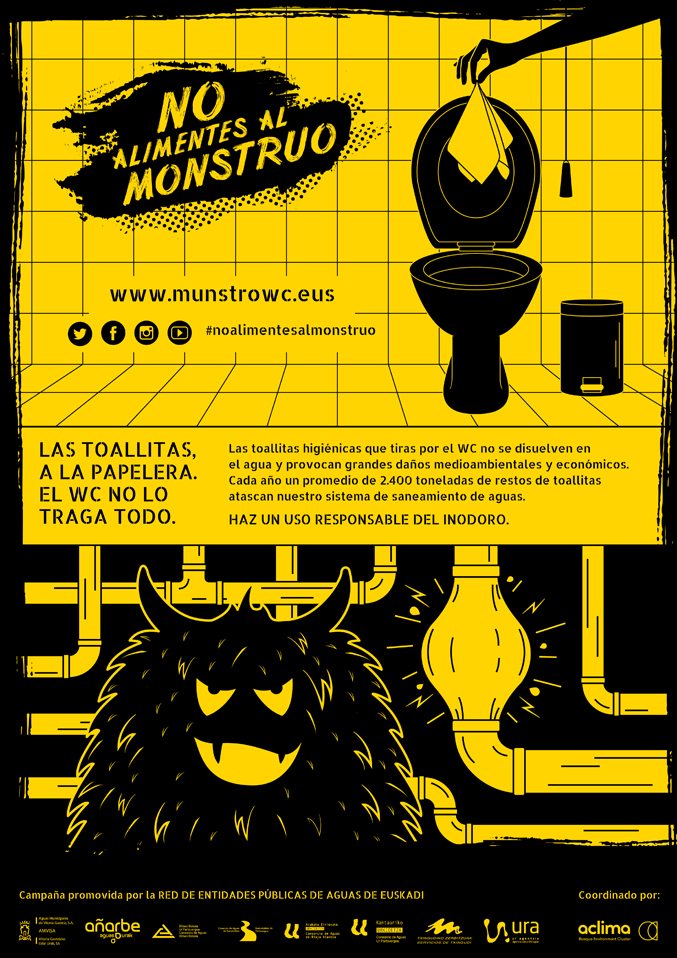 "Ez elikatu munstroa" kanpainaren bitartez, paper-zapi bustiak komuneko zulotik behera botateak dakarzan arriskuen barri emon gura jake herritarrei, ohitura arduratsuagoak aukeratzeko horren ordez.