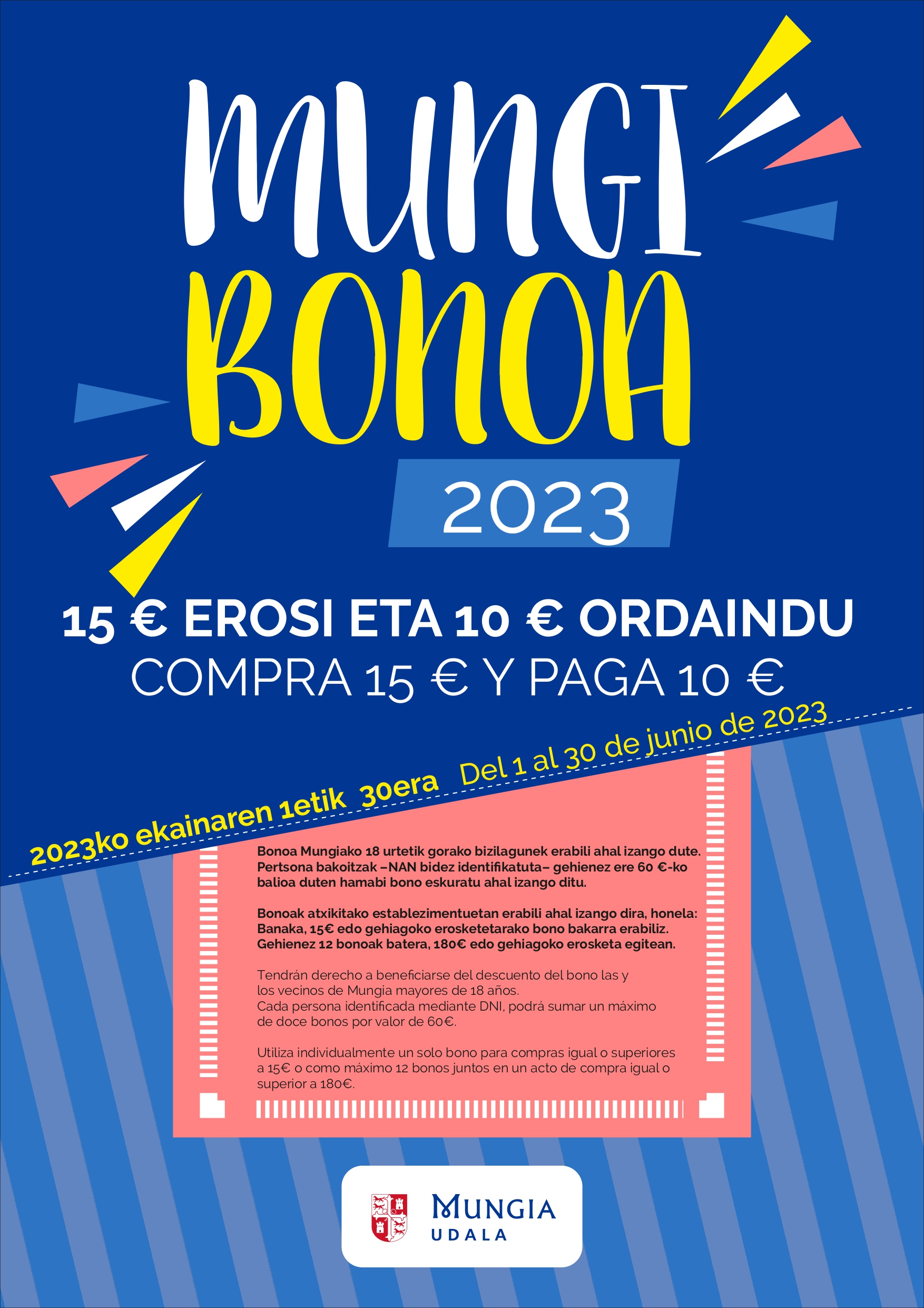 16 urtetik gorako Mungiako bizilagunek izango dute bonoaren deskontuaz baliatzeko eskubidea. Pertsona bakoitzak –NAN bidez identifikatuta– gehienez ere 60 €-ko balioa duten 12 bono eskuratu ahal izango ditu: